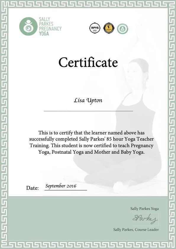 2016 September Pregnancy, Post Natal & Mum and Baby Yoga TT 85 hours with Sally Parkes (& Elliott)